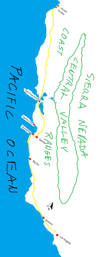 1968, the summer I turned fourteen, we didn’t go to those mountains in the northeast of the state because my father was teaching a course for biology teachers at Humboldt State, so we went instead up highway 101 through the coastal redwoods and to a rented house north of Arcata, near McKinleyville, on a bluff overlooking the Pacific. It had been advertised as four bedrooms on a cliff above the beach, a description that omitted one of those rooms being packed solid with the absent owner’s belongings, and the freeway (albeit not a very busy one – it was one of those remote rural freeways that American highway funding has built because it must) at the foot of the cliff, between us and the beach. The prevailing northwest wind brought fine Pacific air, though on many days with a dose of rotten egg scent from the pulp mill in McKinleyville mixed in. The landlady was off doing some good work with migrant farmworkers in the central valley, not much doh-re-mi, and couldn’t be begrudged the occupied room, and the house was pleasant enough.